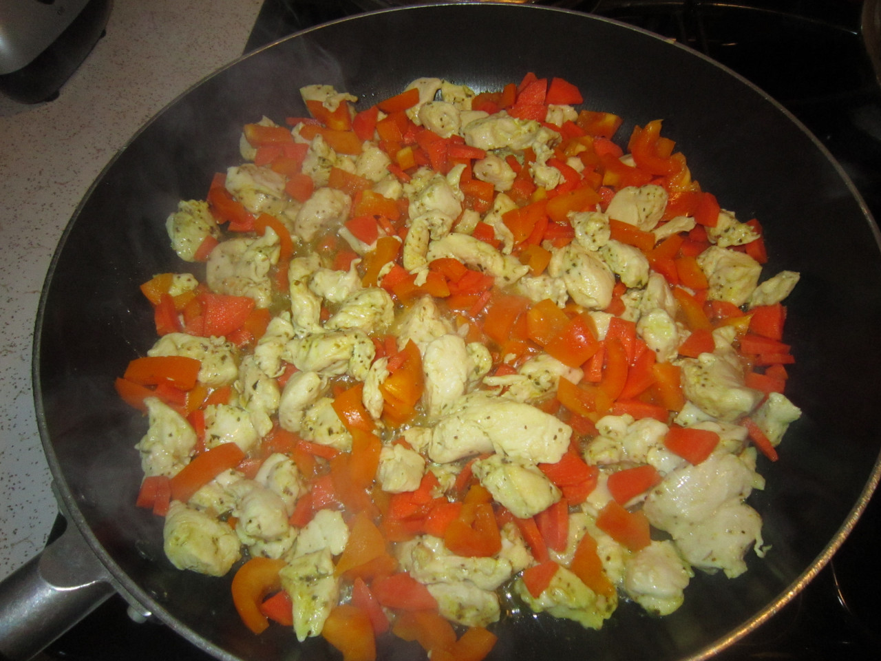 Heat up some olive oil in a frying pan and stir fry chicken pieces for a few minutes, add bell pepper and stir fry for a couple more minutes.