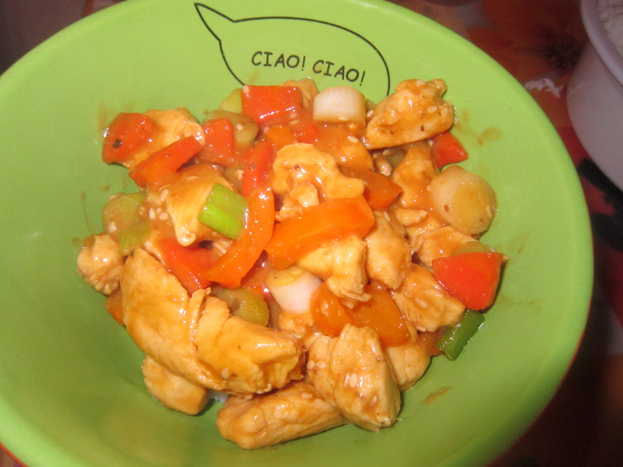 Add chicken and peppers back to the pan and coat with sauce, add scallions and sesame seeds, toss everything for a minute to incorporate all the ingredients.
