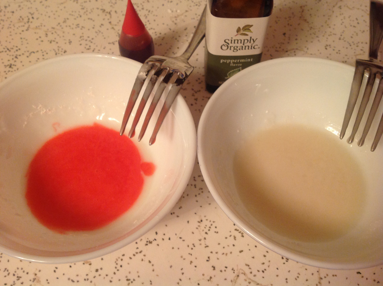 For the vanilla and red mint icing, put a cup of powdered sugar in two separate bowls. Combine each with 2 tspoons of milk, then combine one with mint flavoring and the other one with red food color.